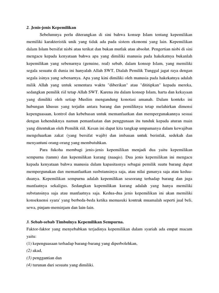 Harta atau modal yang tidak dimanfaatkan bisa dikatakan sebagai harta yang membeku. Segala benda yang dimiliki seserang harus didapat dengan cara yang. Hak dari vita adalah contoh dari. kepemilikan kurang ( naaqis ): Milkiyah atau kepemilikan ialah suatu yang mengatur tentang hak seseorang atas sesuatu atau barang yang karenanya menjadi milik orang tersebut.